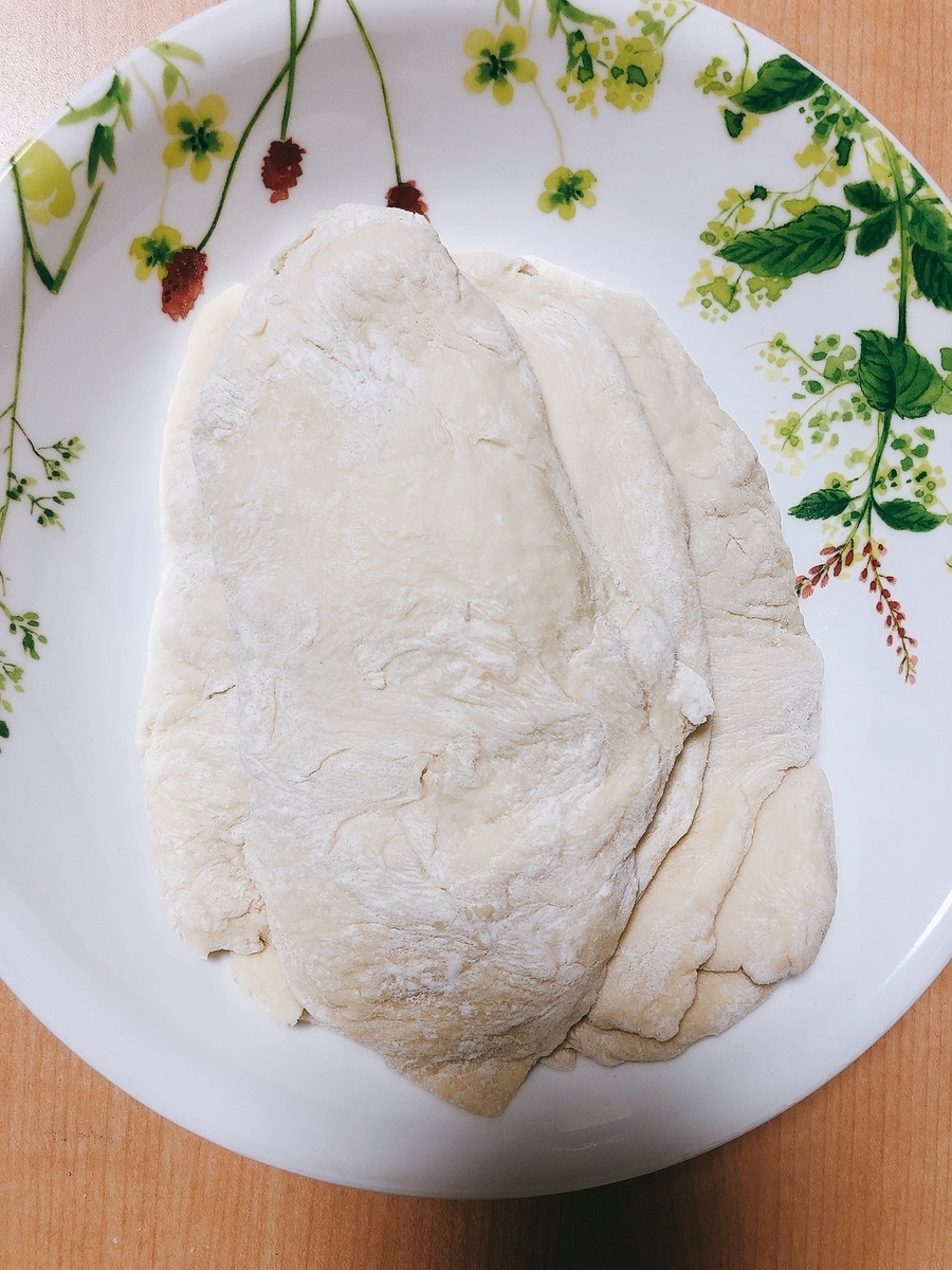 30分常温で熟成後、薄く延ばす。麵棒がなかったため、サランラップの芯で代用する。6枚作れた。